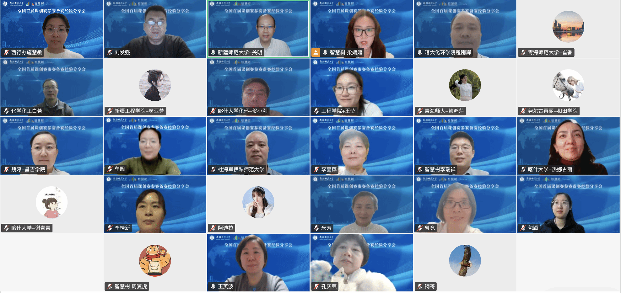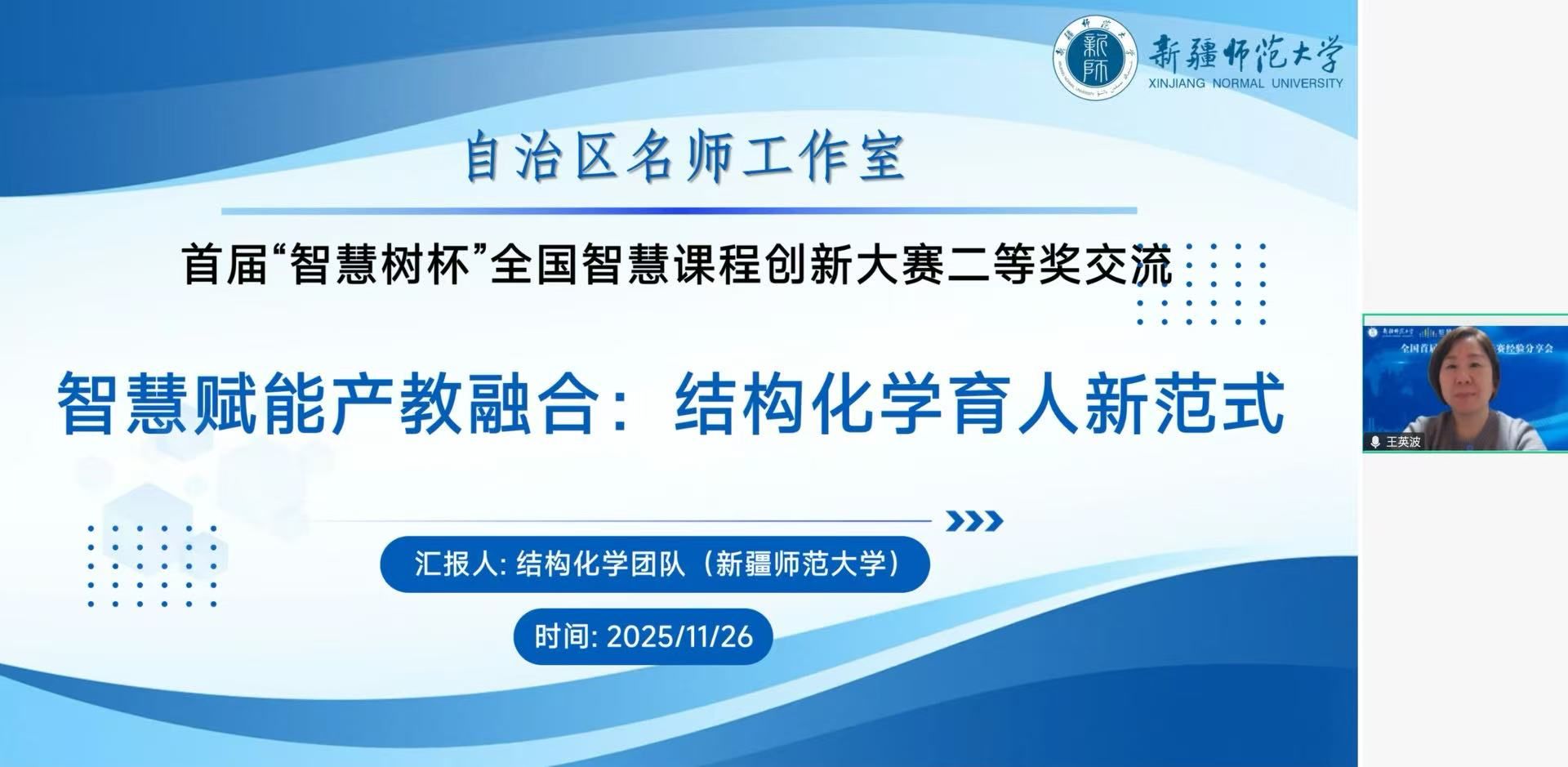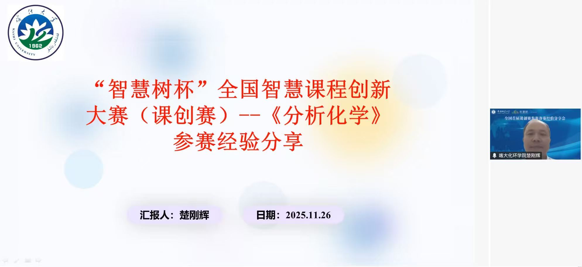 为推动智慧课程建设与教学数字化转型,分享参赛实战经验,化学专业教研西行项目组联合名师工作室线上举办 “全国首届课创赛参赛备赛分享会”。新疆师范大学党委常委、副校长,新疆天山职业技术大学党委书记关明教授主持会议。特邀新疆师范大学化学化工学院副院长王英波教授、喀什大学化学与环境科学学院副院长楚刚辉教授(自治区天山英才楚刚辉名师工作室、教研西行项目负责人)、新疆工程学院化学与环境工程学院刘发强副教授作专题分享, 三位团队负责人带领青年教师分别斩获首届 “智慧树杯” 全国智慧课程创新大赛二等奖。疆内外多所高校化学学科30余名教师云端参会。