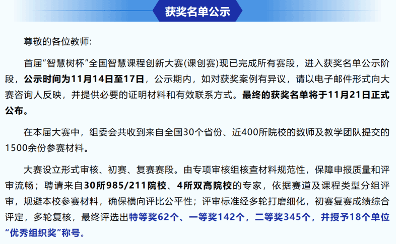 在首届“智慧树杯”全国智慧课程创新大赛中,我院王英波教授、车圆圆博士、孔庆荣博士组成的教学团队凭借《结构化学》知识图谱AI课程的创新设计与扎实实践,经过多轮严格评审与复核,最终荣获全国二等奖。