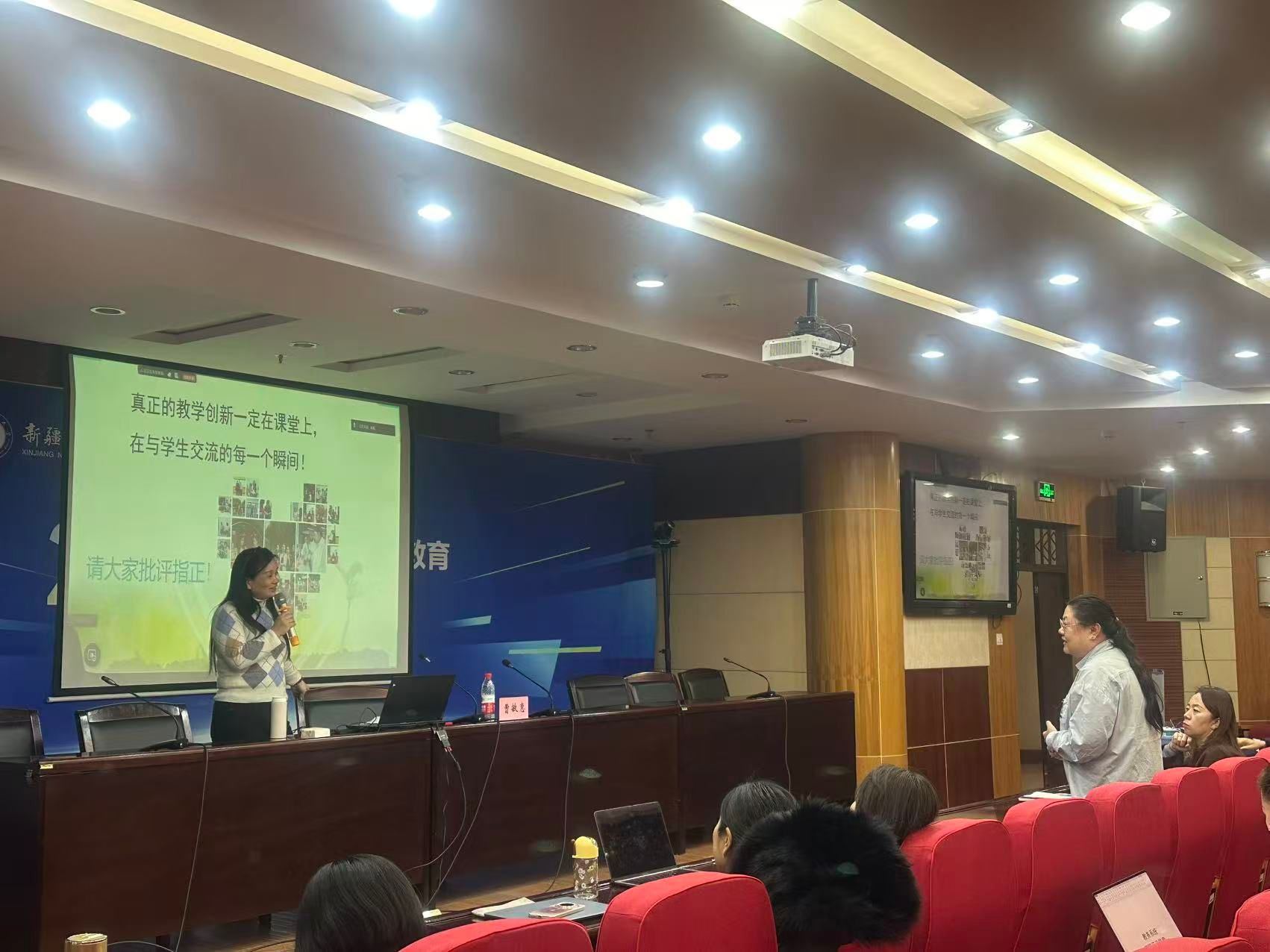 次日上午,曹教授通过线上线下相结合的方式,面向全校教师作了题为“研创融合、HI-AI协同引领教学创新新范式”的专题讲座。她从“教学创新中的最大困惑”切入,深入解读赛事宗旨与政策导向,厘清评分标准背后的创新要求。曹教授特别强调,教学创新应回归“真问题”、实现“真解决”,从而形成可推广的新范式。
