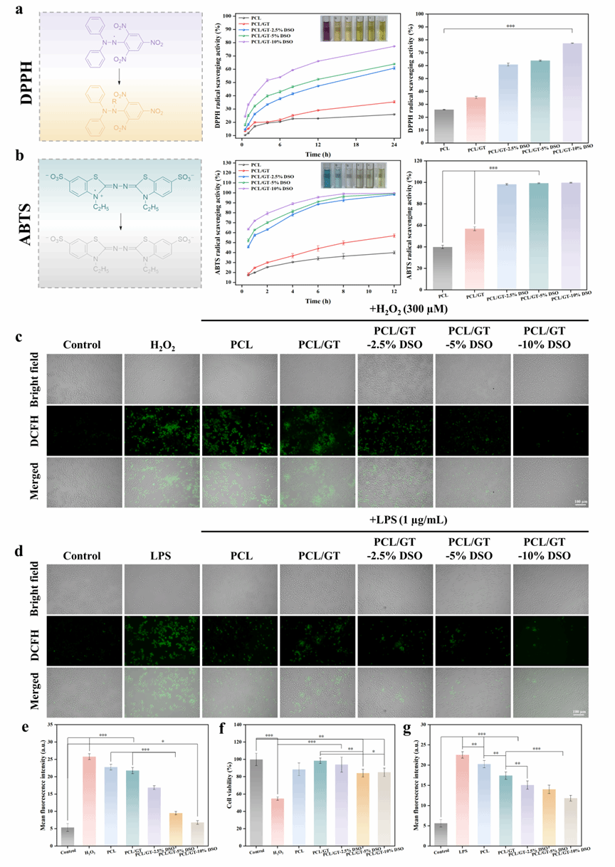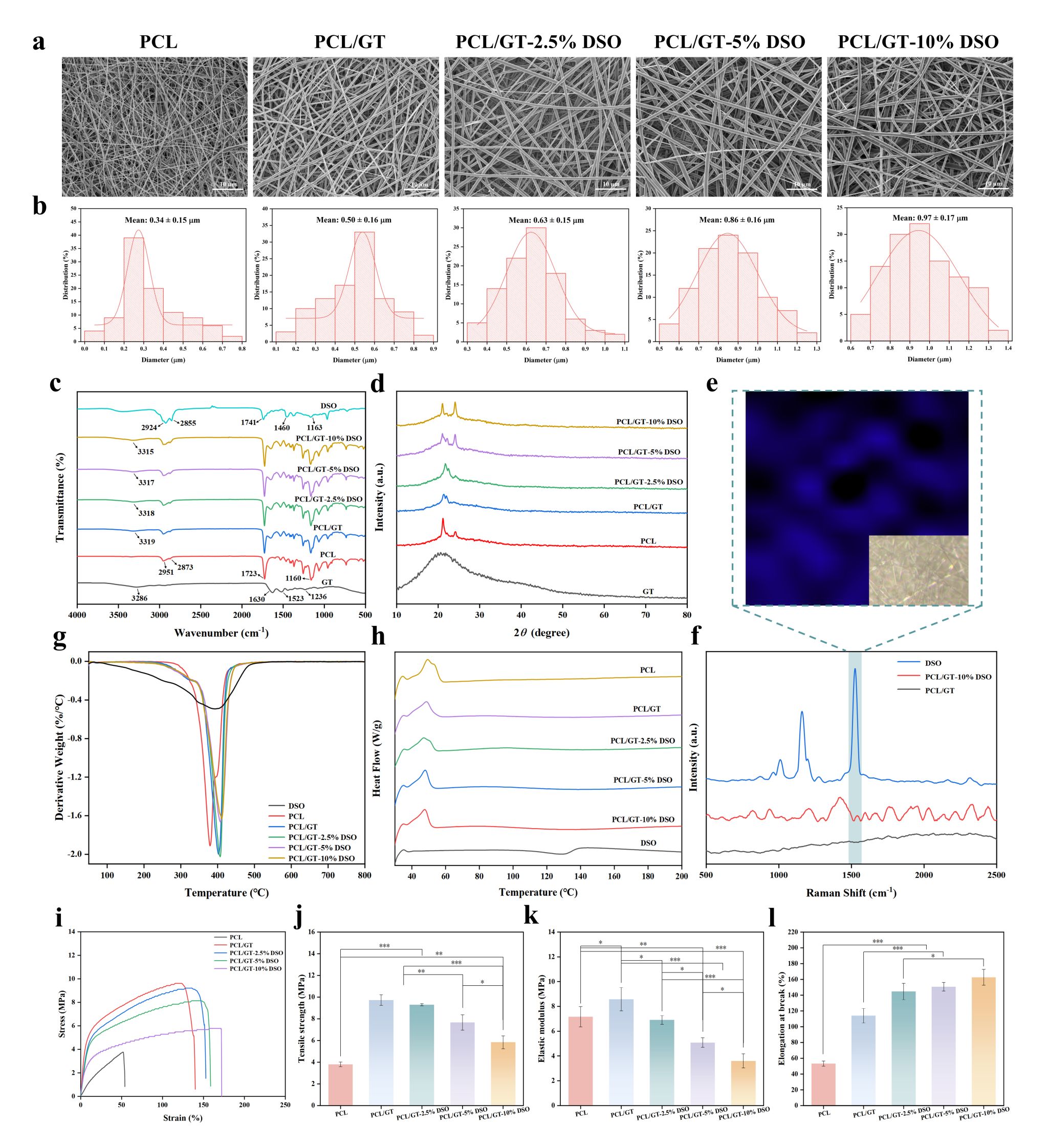 该工作通过静电纺丝将盐藻油脂包封于聚己内酯/明胶纳米纤维中实现长效保护与释放。该纤维平均直径0.34–0.97 μm,可模拟细胞外基质结构。热分解温度达410 °C,拉伸强度最高为5.85 MPa,断裂伸长率162.67%。孔隙率>70%,水蒸气透过率3684–4051 g·m−2·d−1,接触角在63°–121°之间,24 h吸水率>170%,可持续释放盐藻油脂达30天,累计释放率>70%,遵循非Fickian扩散。CCK-8显示细胞存活率>80%,活死染色几乎无死细胞,溶血率<5%。细胞划痕实验表明负载10%杜氏盐藻油脂的聚己内酯/明胶纳米纤维组24h细胞迁移率达51.7%,显著高于对照组(33.8%)。