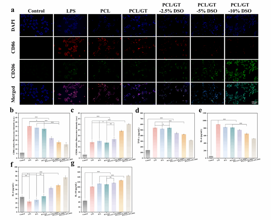 抗氧化活性方面,负载10%杜氏盐藻油脂的聚己内酯/明胶纳米纤维组对DPPH/ABTS自由基清除率大于98%。在H2O2或脂多糖诱导的小鼠腹腔巨噬细胞模型中,盐藻油脂纤维显著降低胞内ROS水平,提高细胞存活率。免疫荧光显示盐藻油脂纤维促使巨噬细胞由促炎表型M1向抑炎表型M2极化,酶联免疫测试证实该纤维可显著下调细胞促炎因子TNF-α、IL-6分泌水平,上调抗炎因子IL-4、IL-10促炎因子。本研究构建的负载杜氏盐藻油脂的聚己内酯/明胶静电纺丝纳米纤维敷料通过清除ROS、调节巨噬细胞极化和炎症因子,有效改善伤口微环境,在创面修复领域具有广阔应用前景。