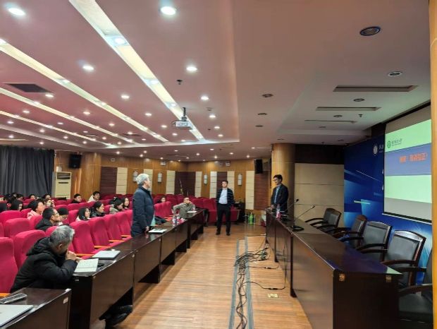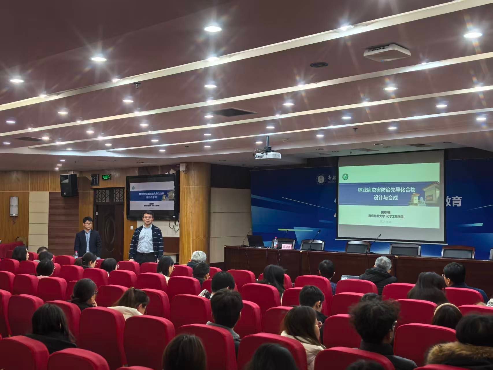 2025年12月12日,化学化工学院第六届“学术月”系列学术活动,特邀南京林业大学化学工程学院副院长、博士生导师黄申林教授作题为《林业病虫害防治先导化合物设计与合成》的专题分享,报告由校党委常委、副校长刘晨江教授主持,学院教师及研究生代表参会。