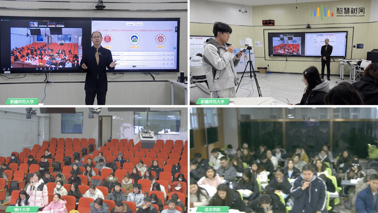 值得一提的是,2025年秋季学期,两次名校名师主讲的同步课堂助力了化学专业西行项目的推进实施。2025年10月21日,新疆师范大学携手南开大学、喀什大学开展三校同步课堂,由南开大学王荷芳教授主讲“质谱分析法”,主课堂设在南开大学智慧教室。2025年12月2日,北京师范大学范楼珍教授团队与新疆师范大学蔡燕军博士联合英国曼彻斯特大学教授Patrick J. O’Malley,依托智慧课程平台,开展了基于“化学专业AI西部行”计划的物理化学同步课堂教学活动,实现了智慧化、国际化与跨区域协同育人的深度融合。
