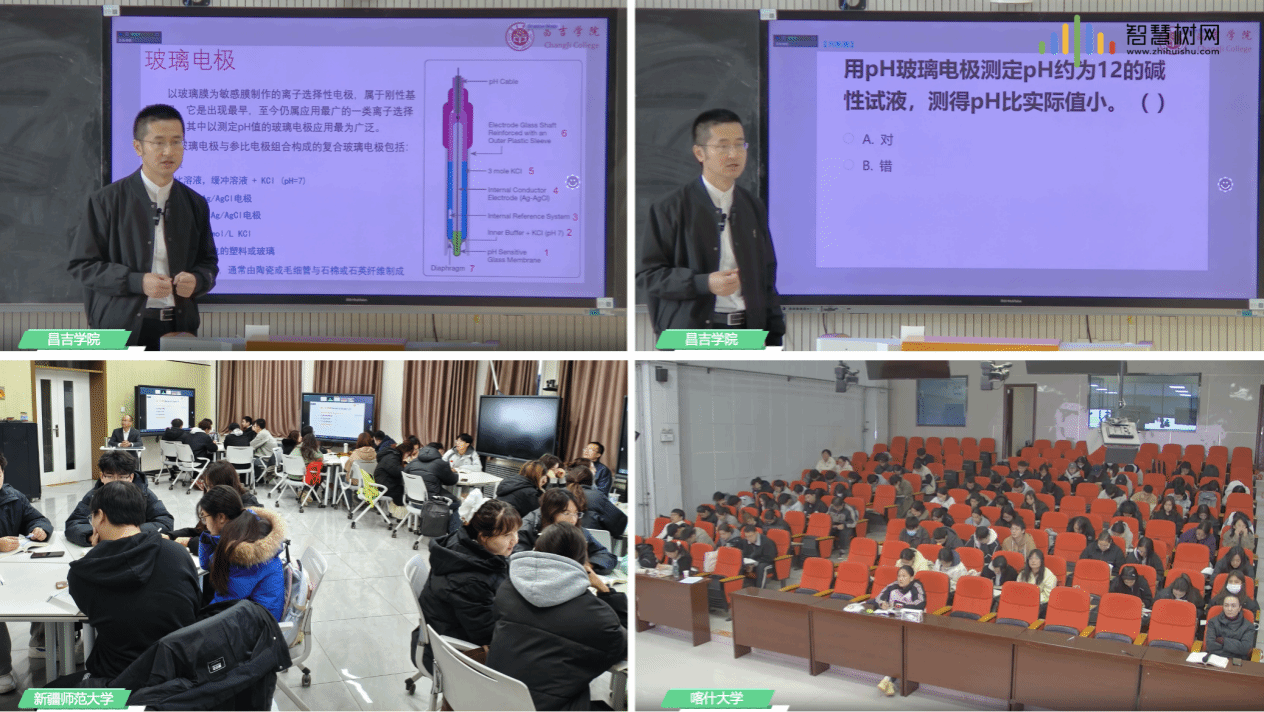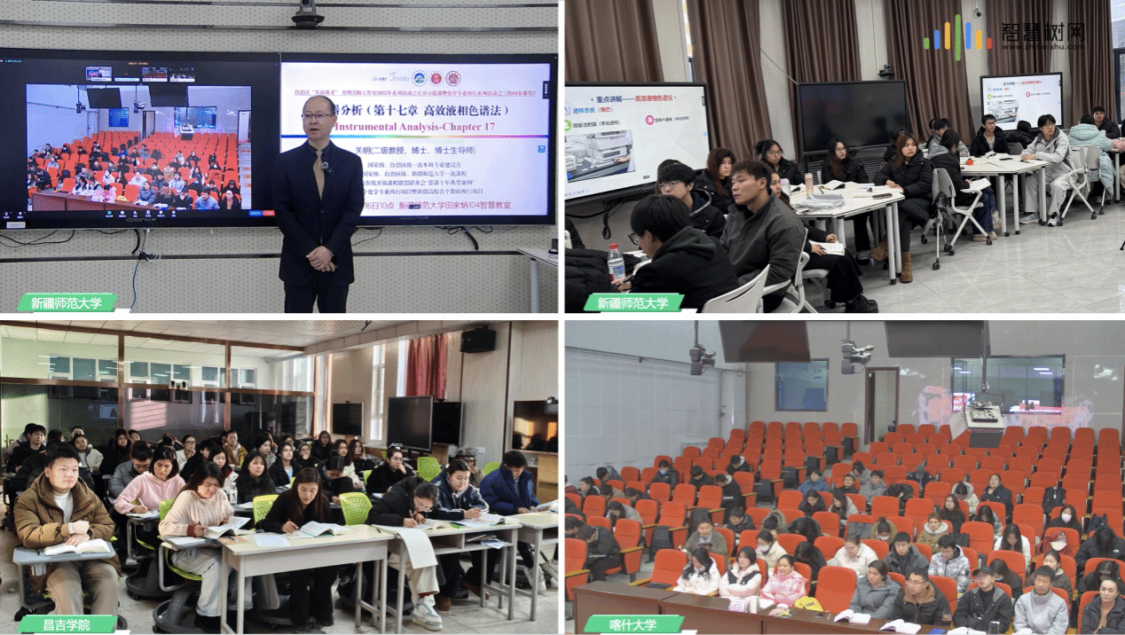 近三年来,关明教授牵头的西行同步课堂不断改革创新,深受疆内院校师生的好评。2023年春秋两季学期,开展了喀什大学-新疆师范大学两校《仪器分析》同步课堂。2024年春秋两季学期,开展了喀什大学-新疆师范大学-昌吉学院三校基于智慧课程的《仪器分析》同步课堂,主课堂均设在新疆师范大学,关明教授主讲。2025年春季学期,喀什大学-新疆师范大学-昌吉学院三校基于教研西行的《仪器分析》同步课堂,主课堂先后分别设在新疆师范大学、昌吉学院和喀什大学(全景教室),由关明教授主讲。2025年秋季学期,喀什大学-新疆师范大学-昌吉学院三校基于专业西行的《仪器分析》同步课堂继续开展,首次同步课堂的主课堂设在喀什大学,由工作室和项目组核心成员、喀什大学热娜古丽·阿不都热合曼教授主讲,第二次则由昌吉学院引进人才刘宪春博士后接棒,最后由新疆师范大学关明教授收官讲授。